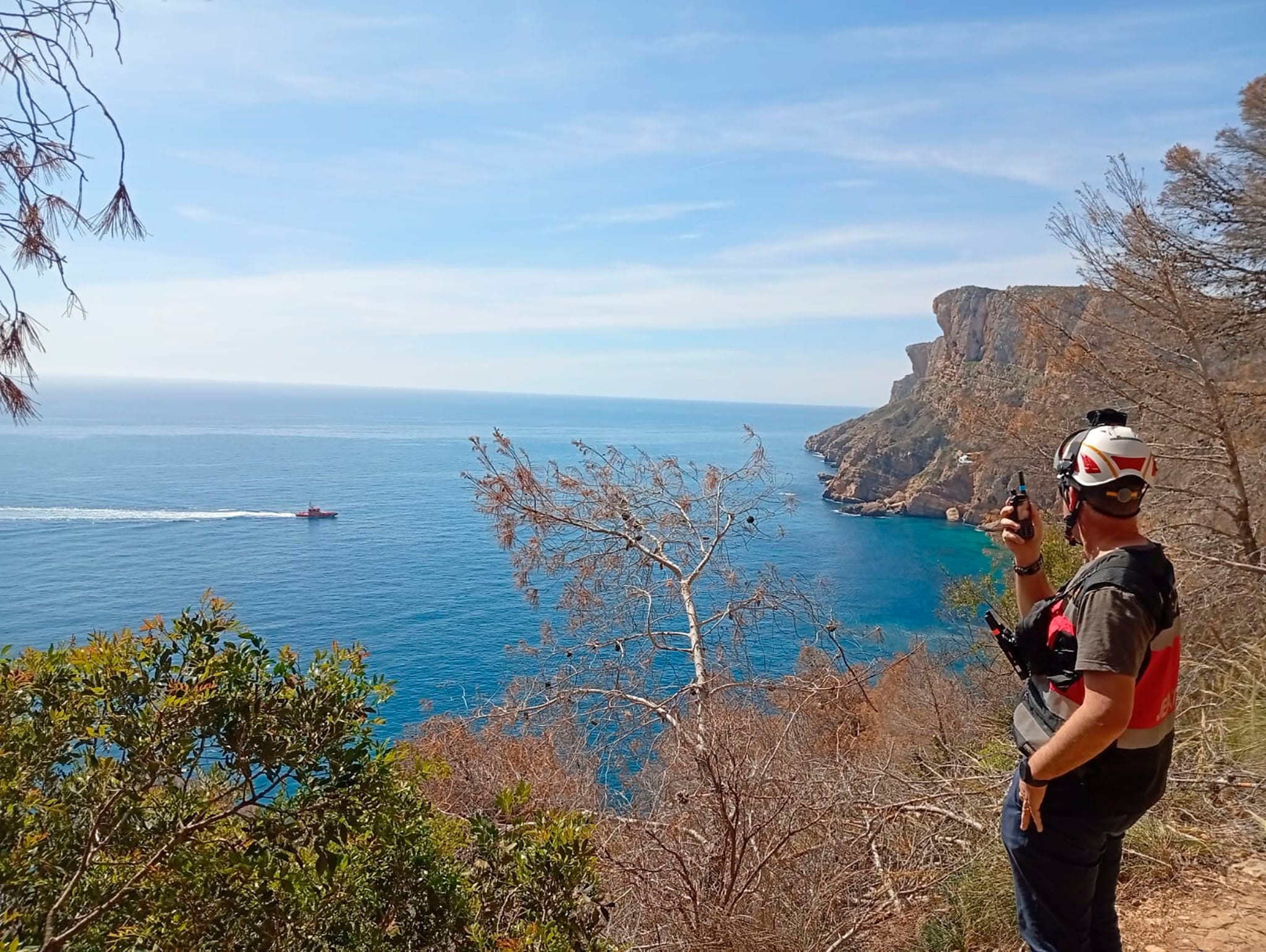 01 de abril de 2025 - 14:47 Foto Anterior4 de 4Ver el artículo original: Alarma por una persona colgando entre unos acantilados de Benitatxell Acantilados de la cala Llebeig de Benitatxell Zoom a la persona funambulista colgada entre los acantilados de Benitatxell Helicóptero preparado para rescatar a la persona en Benitatxell Efectivos de Benitatxell vigilando la zona donde estaba el funambulista
