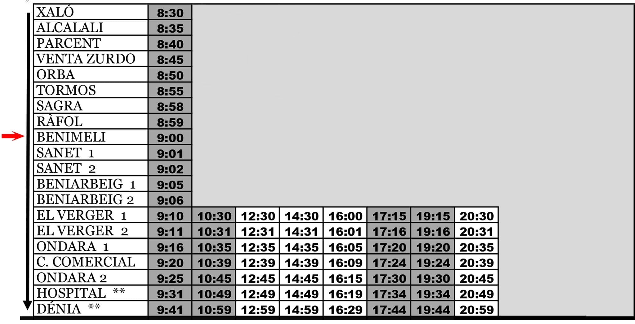 08 de junio de 2022 - 07:37 Foto Anterior4 de 5Foto SiguienteVer el artículo original: Autobús en Benimeli: horarios, parada y tarifas Parada de autobús en Benimeli Autobús dirección Xaló con parada en Benimeli de lunes a viernes Autobús dirección Dénia con parada en Benimeli entre semana Autobús dirección Dénia con parada en Benimeli el sábado Autobús dirección Xaló con parada en Benimeli el sábado