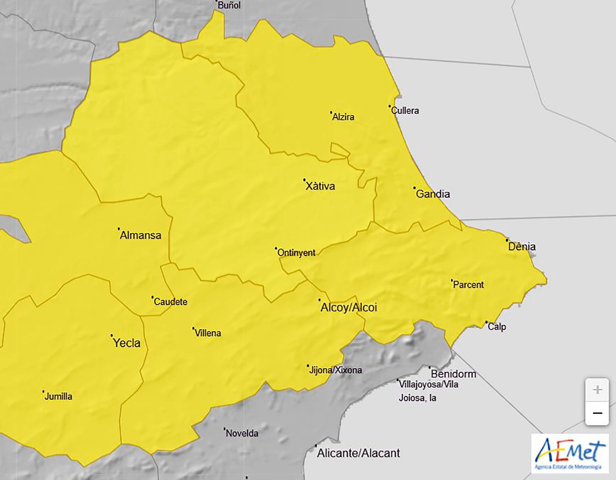 22 de mayo de 2025 - 09:07 Foto Anterior2 de 3Foto SiguienteVer el artículo original: Cambio brusco del tiempo en la Marina Alta: la AEMET emite varios avisos Pareja paseando por la orilla de una playa de Dénia (archivo) Mapa de avisos activos de la AEMET el viernes 23 de mayo 2025 en la Comunitat Valenciana Mapa de predicción de la AEMET en Alicante para el viernes 23 de mayo 2025 a las 14.00 horas