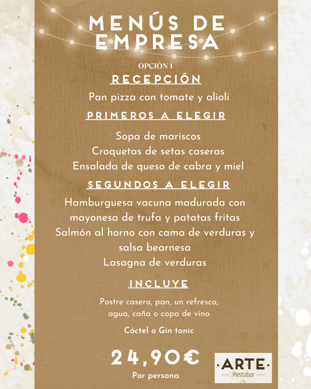 09 de diciembre de 2022 - 14:30Un delicioso y completo menú por 24,90€ 1 de 2Foto SiguienteVer el artículo original: Descubre los deliciosos menús de empresa que Arte Restobar ha preparado para estas fiestas Menú de empresa 1 en Arte Restobar Menú de empresa 2 en Arte Restobar