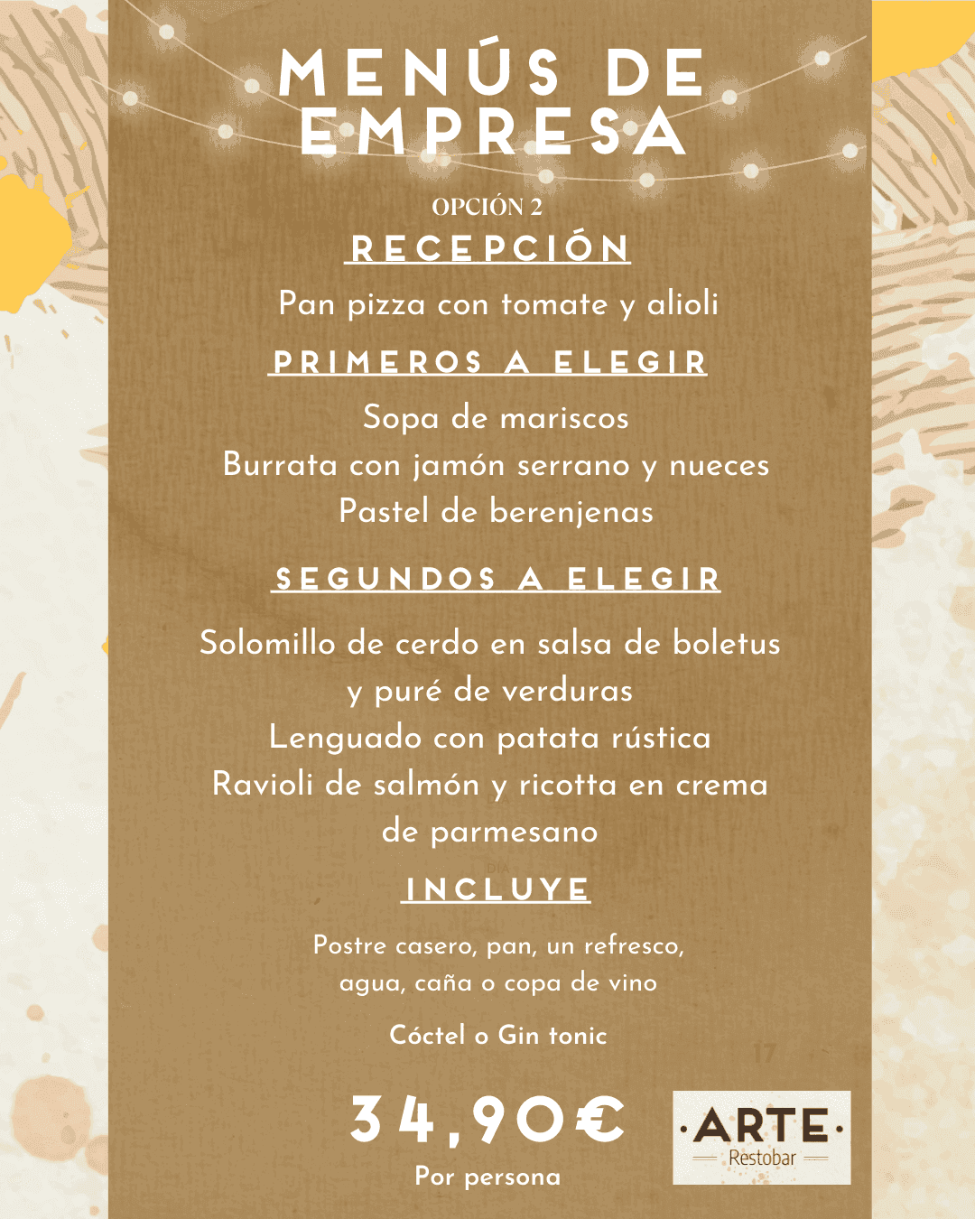 09 de diciembre de 2022 - 14:31Un delicioso y completo menú por 34,90€ Foto Anterior2 de 2Ver el artículo original: Descubre los deliciosos menús de empresa que Arte Restobar ha preparado para estas fiestas Menú de empresa 1 en Arte Restobar Menú de empresa 2 en Arte Restobar
