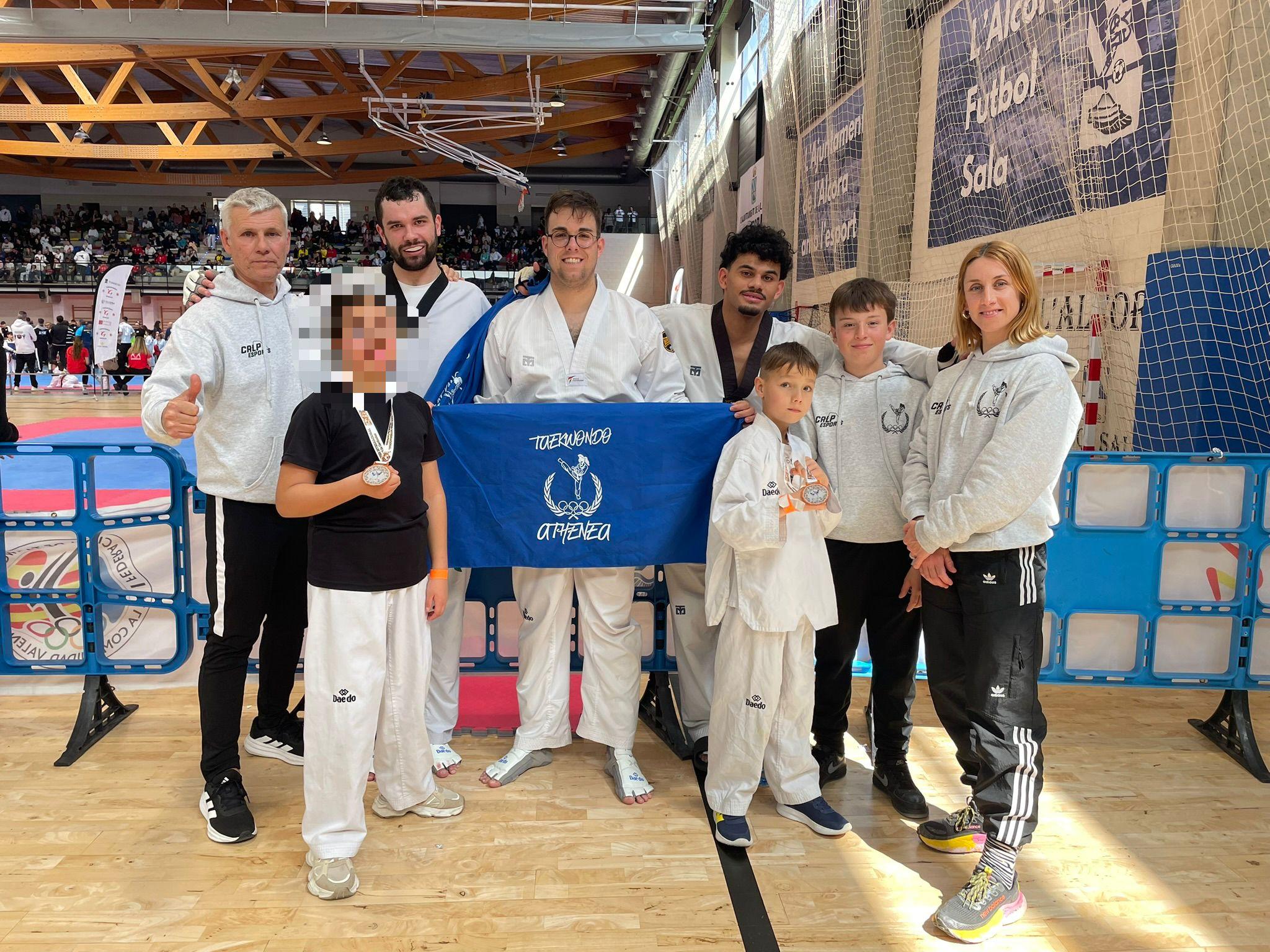 El equipo del Club de Taekwondo Athenea de Calp posa con su bandera y medallas tras participar en el Open Internacional de L'Alcora.