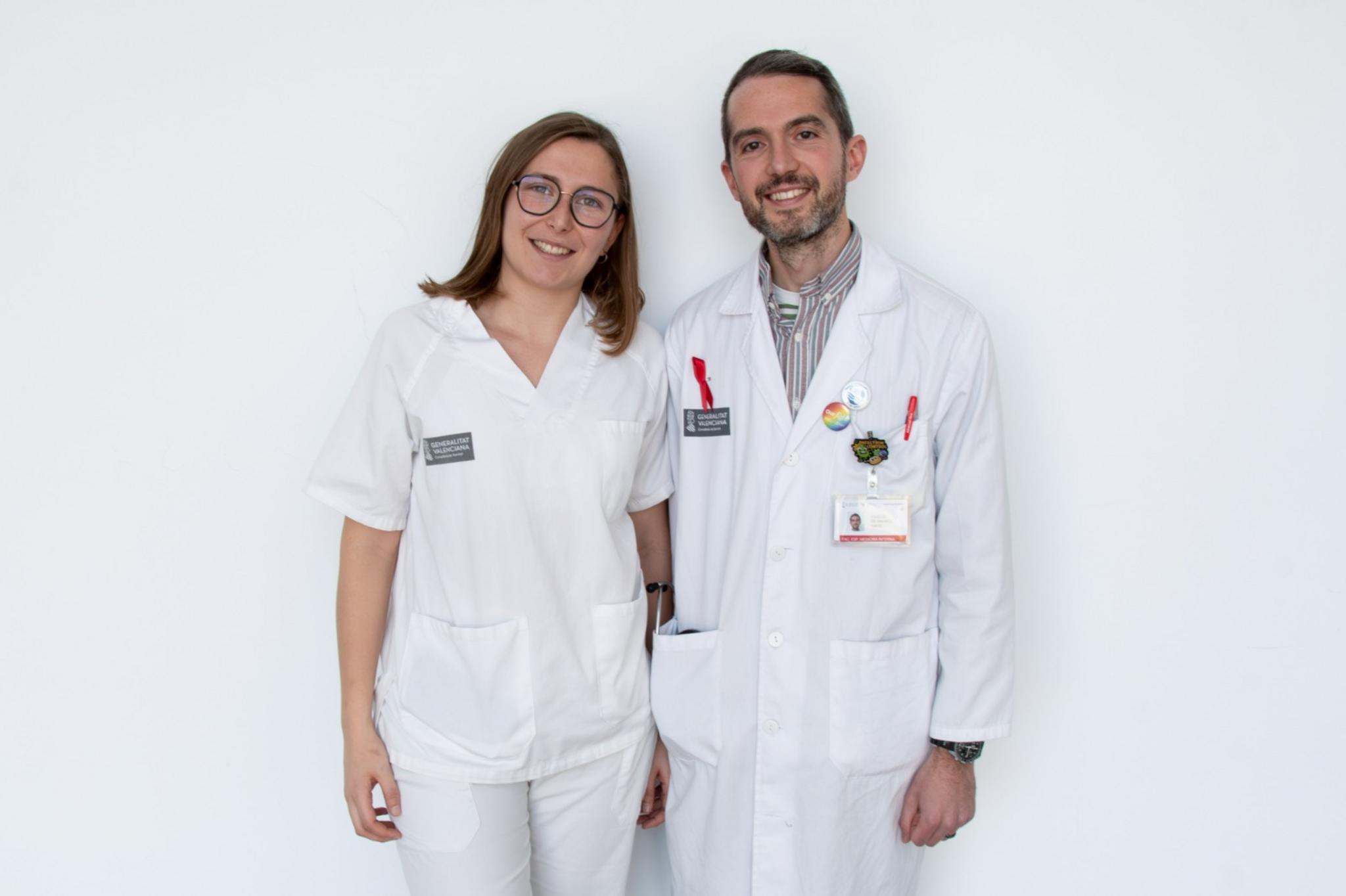 Retrato del Dr. Carlos de Andrés David y la enfermera Carla Pérez Server, del Hospital de Dénia, posando juntos ante una pared blanca. Ambos llevan uniformes de trabajo y sonríen a la cámara.