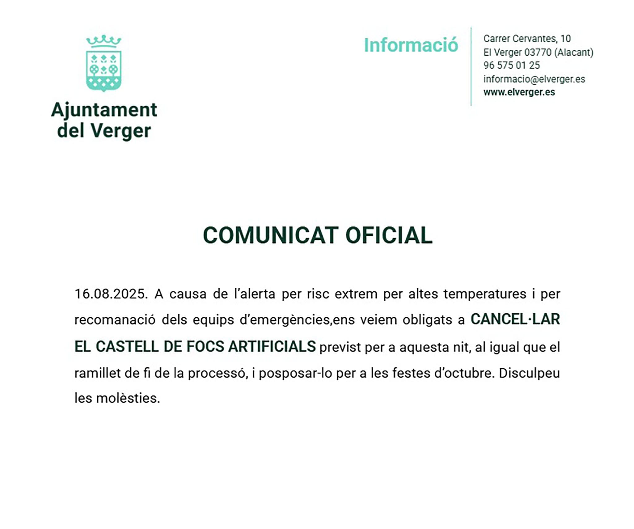 16 de agosto de 2025 - 19:35 1 de 2Foto SiguienteVer el artículo original: El Verger suspende el castillo de fuegos artificiales de fin de fiestas Comunicado oficial del Ayuntamiento del Verger que suspende el castillo de fuegos artificiales Correfoc en El Verger sobre el riu Girona en 2022 (archivo)
