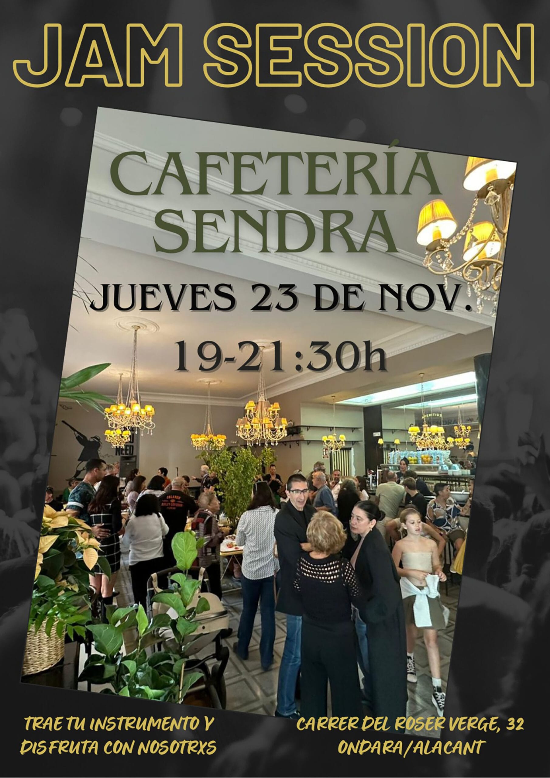 23 de noviembre de 2023 - 10:16 1 de 2Foto SiguienteVer el artículo original: Ondara se convertirá en el epicentro de la improvisación musical para despedir el año Cartel de la primera Jam Session Fachada de la cafetería en la que tendrán lugar las Jam Session