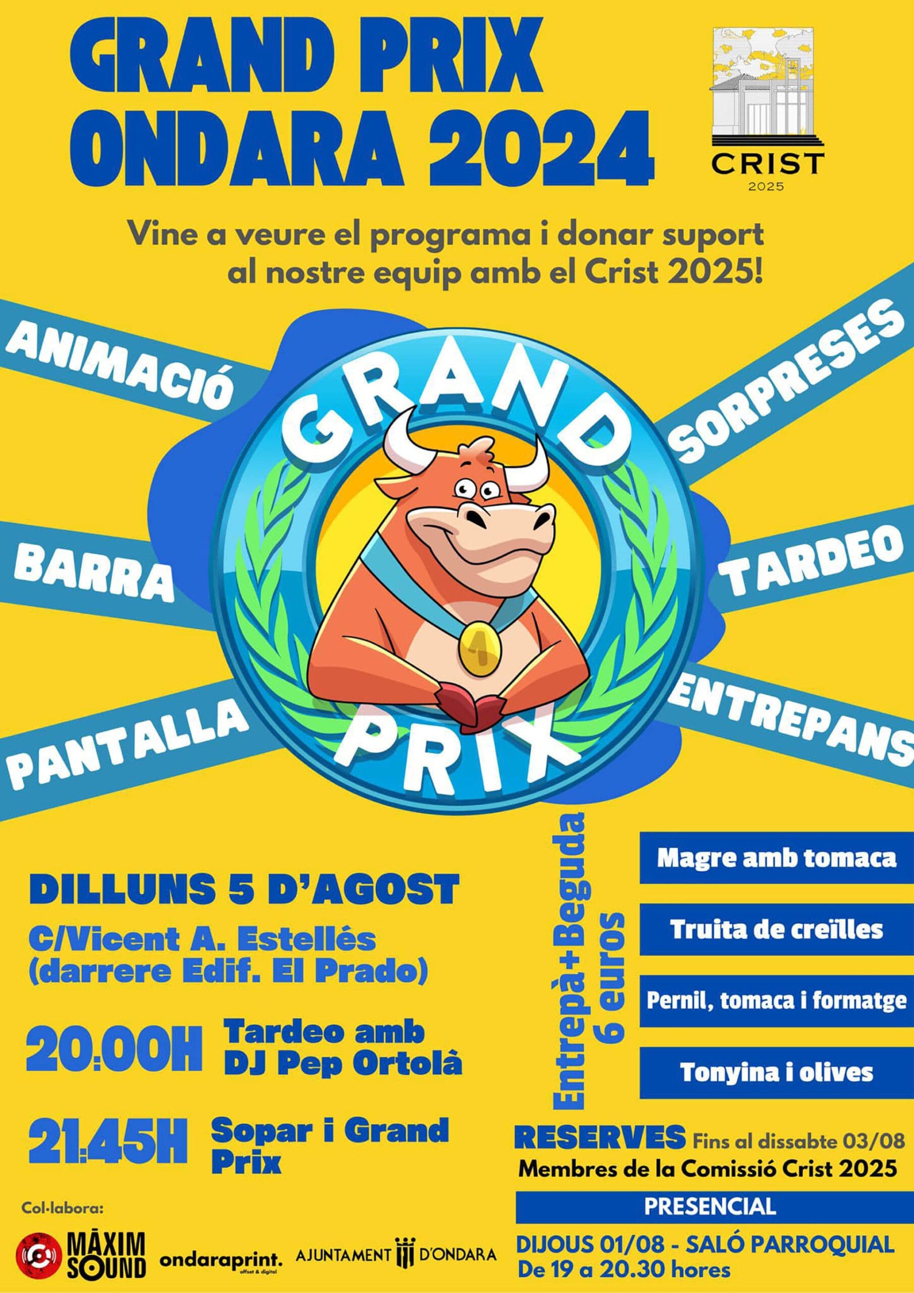 02 de agosto de 2024 - 09:05 Foto Anterior2 de 2Ver el artículo original: Pantalla gigante y «tardeo» para animar al equipo de Ondara en el programa del Grand Prix pospuesto Evento para ver en pantalla gigante a Ondara en el Grand Prix 2024 Cartel del evento para ver en pantalla gigante a Ondara en el Grand Prix 2024